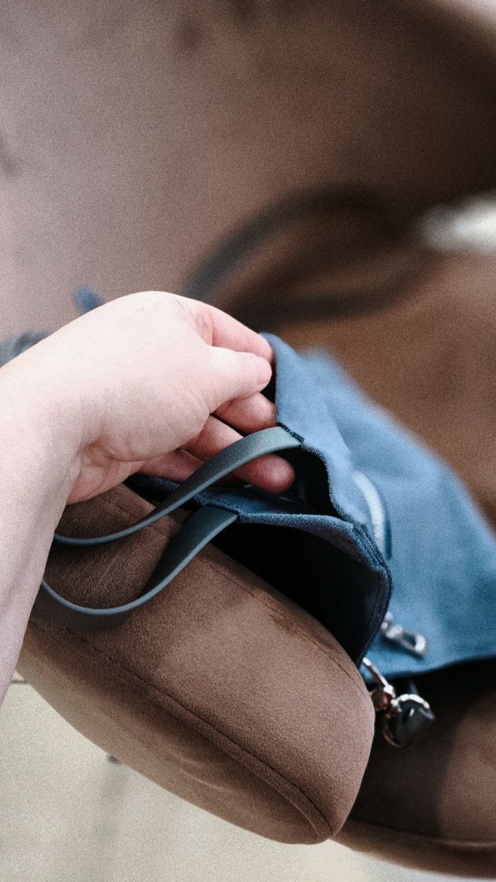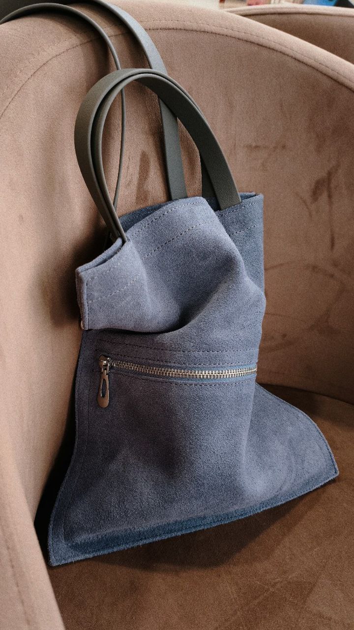 Материал: натуральная кожа -велюр в цвете джинс не линяет и не пачкает одежду.