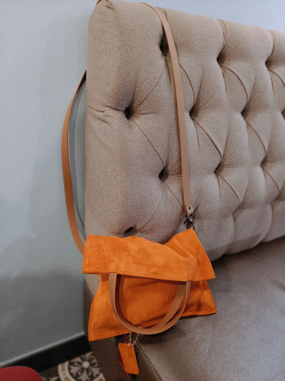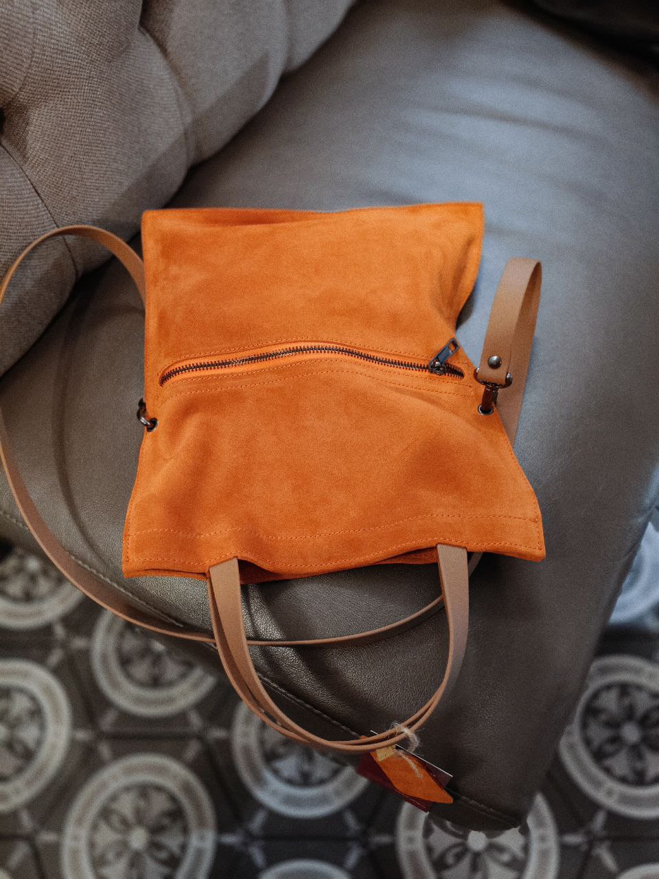 Материал: натуральная кожа -велюр оранжевого цвета, не линяет и не пачкает одежду.