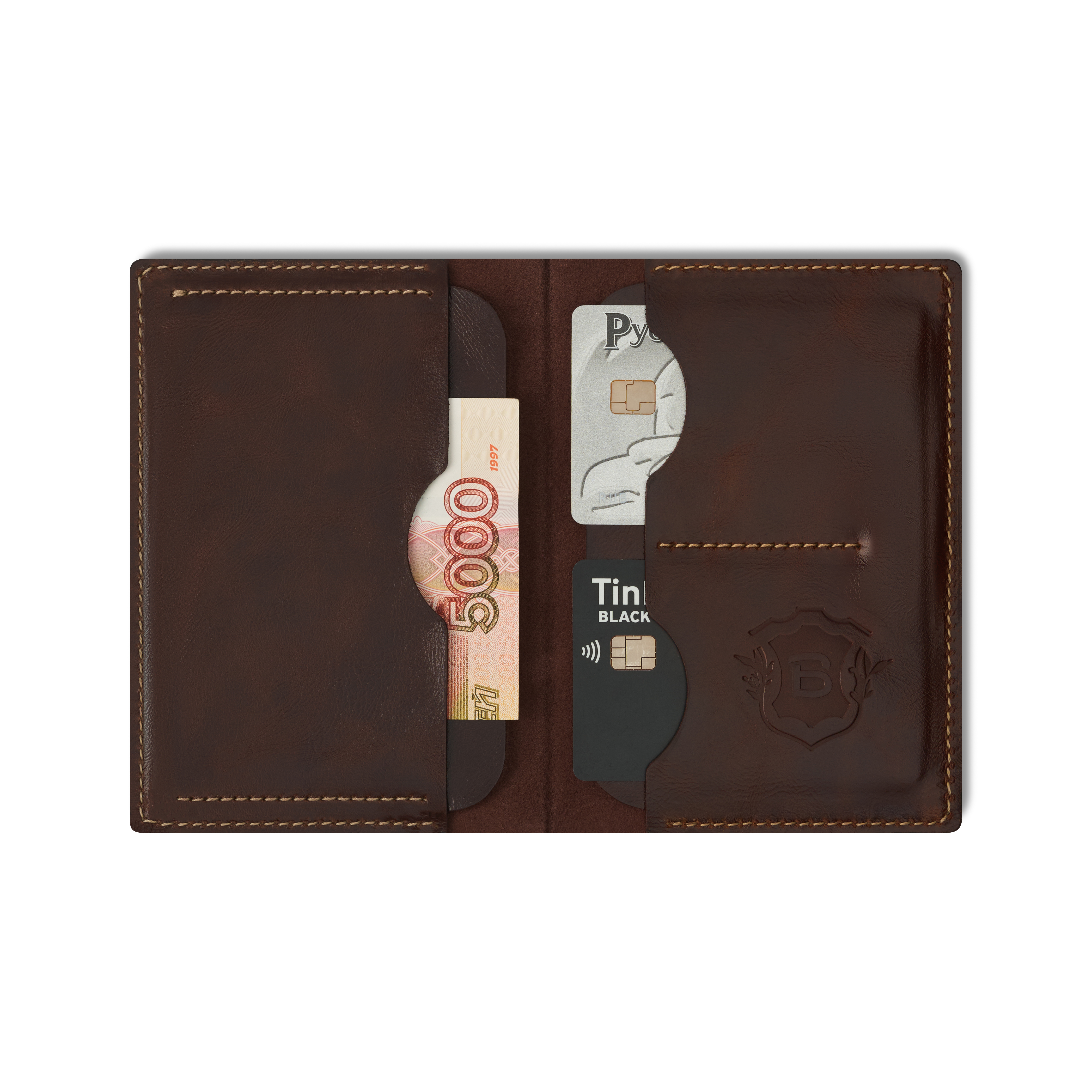 Внутри пять отделений для банковских и топливных карт, СНИЛС, паспорта, документов на машину: права и СТС. Найдётся место для денежных купюр.
