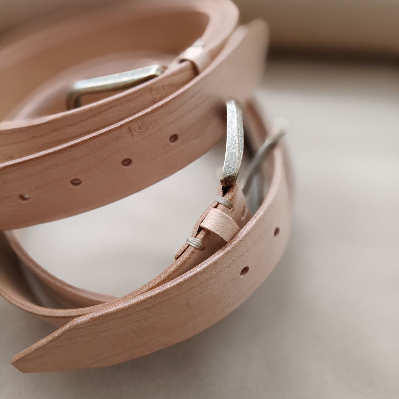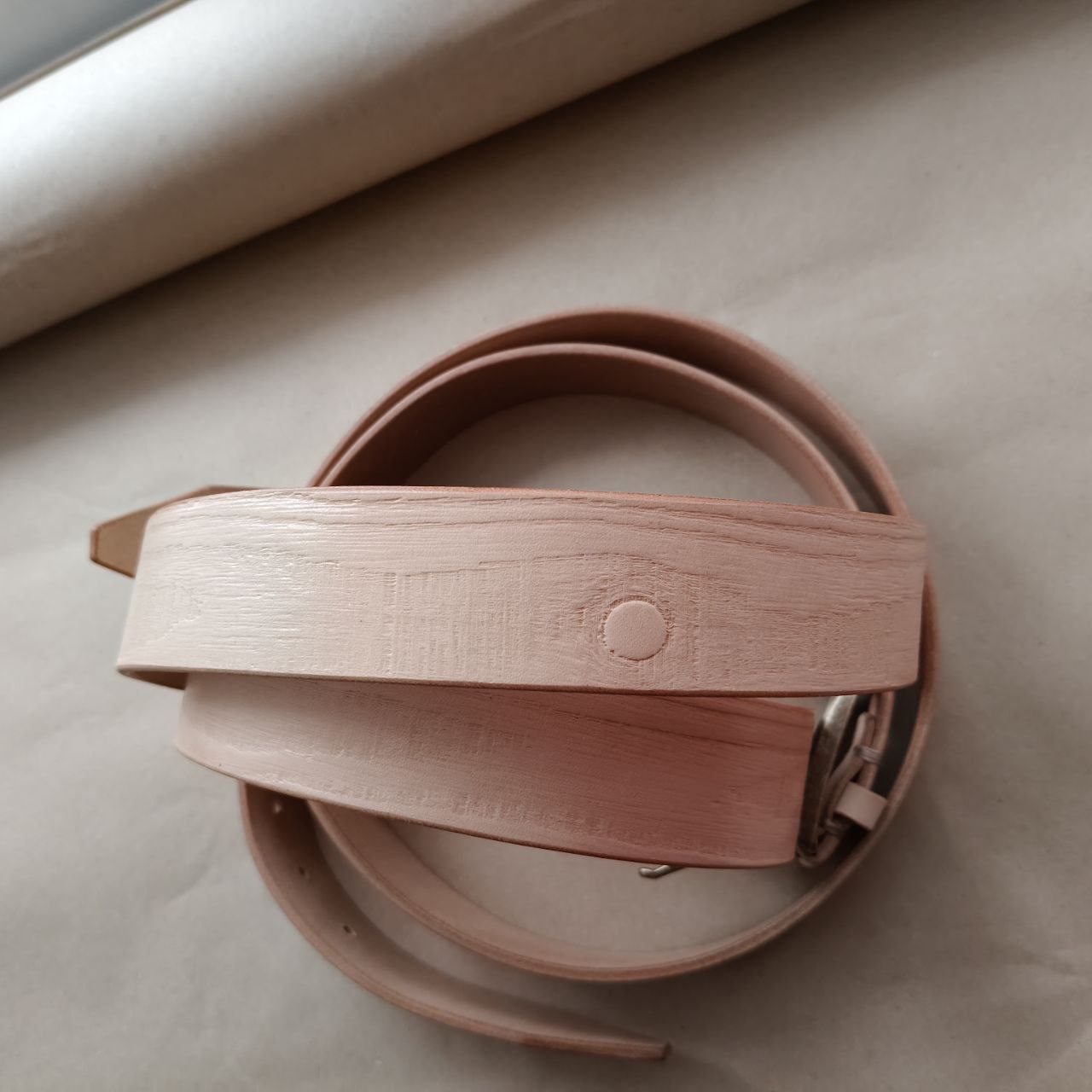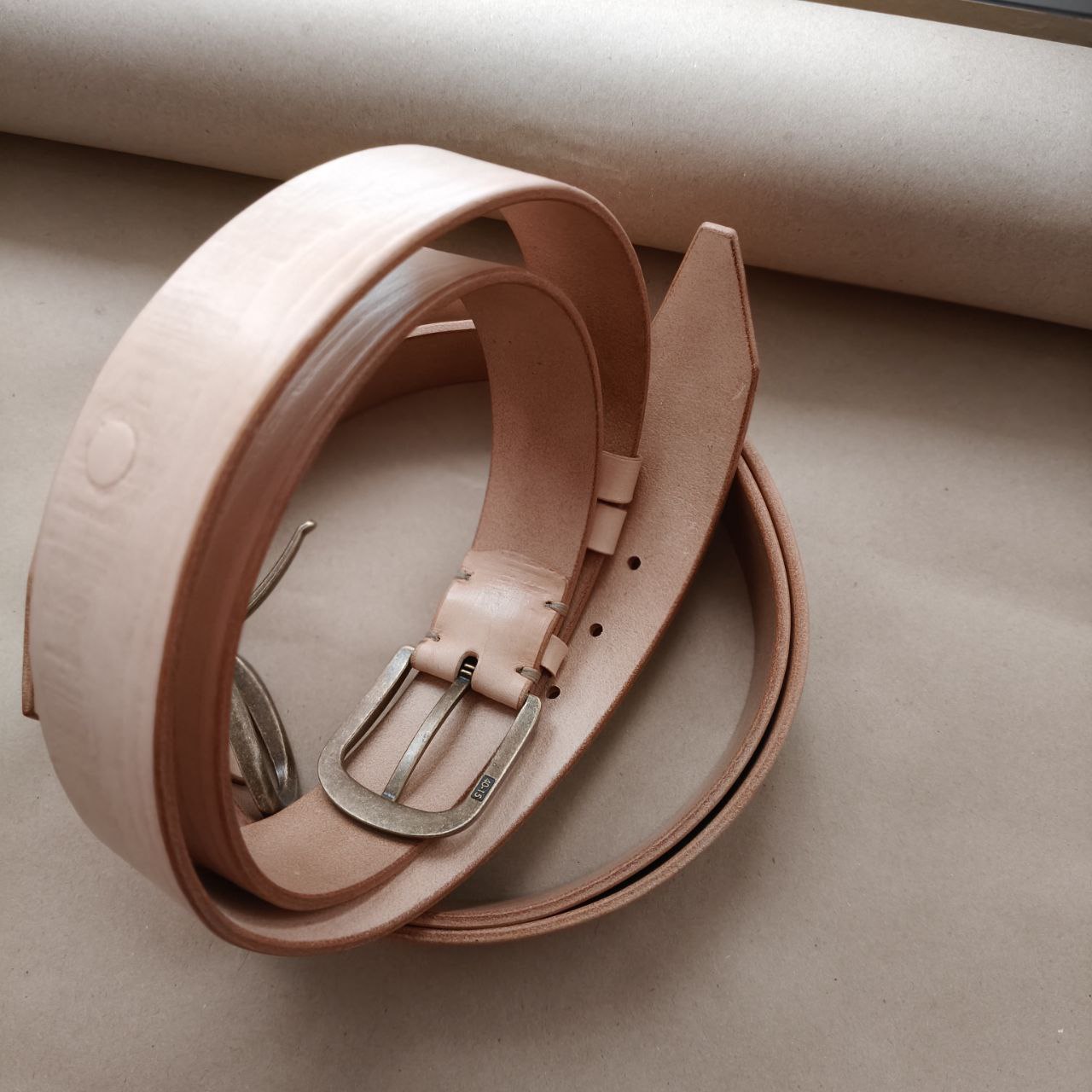 плотная кожа бизона естественного бежевого цвета с тёплым оттенком, закрыли финишным покрытием, срезы идеально заполированы до гладкости.